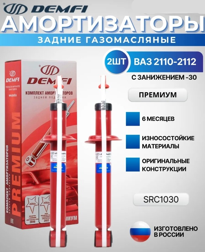 Амортизатор телескопический газомасляный задней подвески для автомобилей семейства 2110-2112 под пружины с занижением -30мм. Поставляется в собранном виде. Стойки и амортизаторы - важнейшие элементы подвески автомобиля, так как именно они отвечают за комфорт и безопасность движения, а так же за стабилизацию кузова и сохранение сцепления колес с дорожным покрытием. Исключают отрыв колёс, возникновение сносов, и уводов при маневрировании. Сбалансированные характеристики при движении как по городу, так и по трассе. Стойки и амортизаторы телескопические DEMFI серии «Премиум» (имеют «жесткость» выше чем у серийных заводских модификаций и DEMFI серии «Комфорт», также есть варианты исполнения с занижением от -30 до -90 мм) специально адаптированы для российских дорог, с целью улучшения управляемости автомобиля. DEMFI Премиум – это лучший выбор для тех, кто желает усовершенствовать техническое состояние демпфирующих элементов подвески автомобиля за приемлемую стоимость.